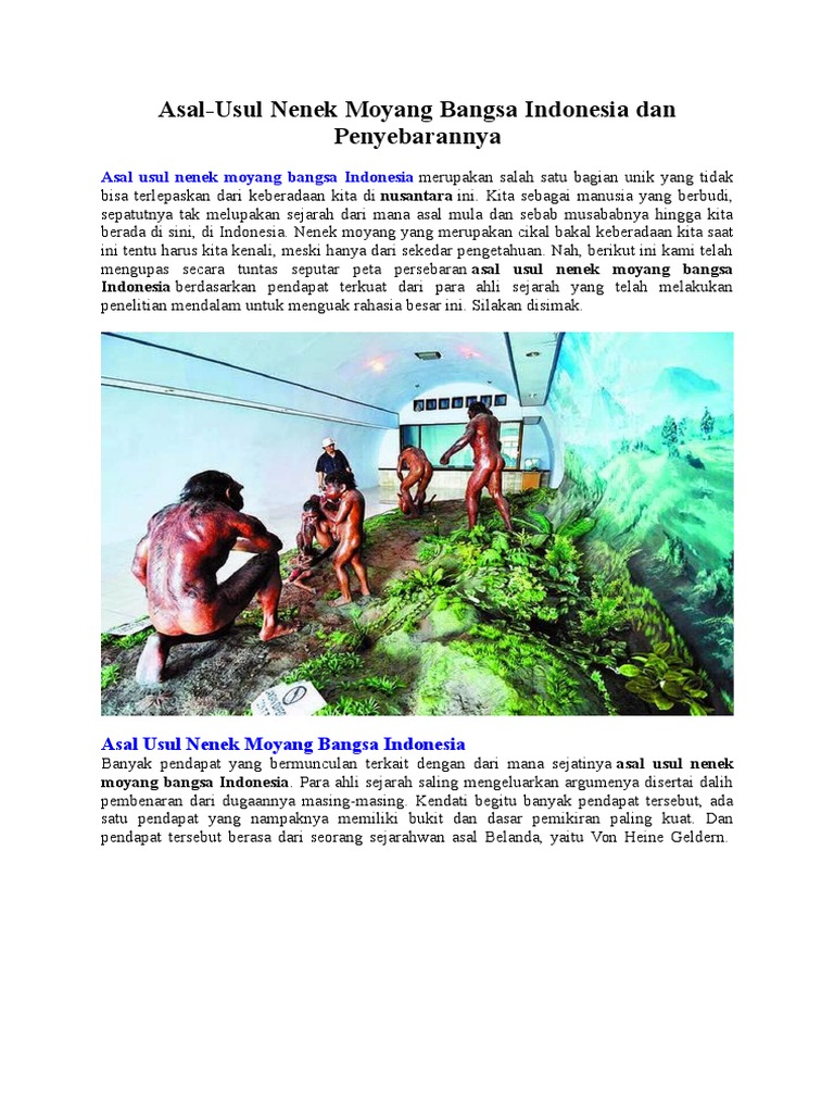 Penasaran! Begini Asal Usul Nenek Moyang Bangsa Indonesia ... (Bettie Chavez) Teori-teori utama yang muncul berkenaan dengan asal-usul nenek moyang bangsa Indonesia didasarkan dari kesamaan bentuk fisik, kemudian kesamaan akar bahasa yang dipergunakan. Bertitik tolak dari pendapat-pendapat di atas, terdapat hal-hal yang menarik tentang asal-usul nenek moyang bangsa Indonesia. Perpindahan itu diprediksi terjadi secara besar-besaran, bahkan diperkirakan juga disebabkan lantaran adanya suatu bencana hebat.